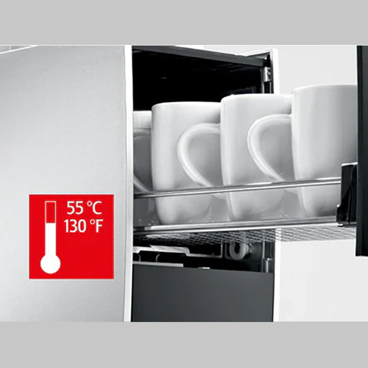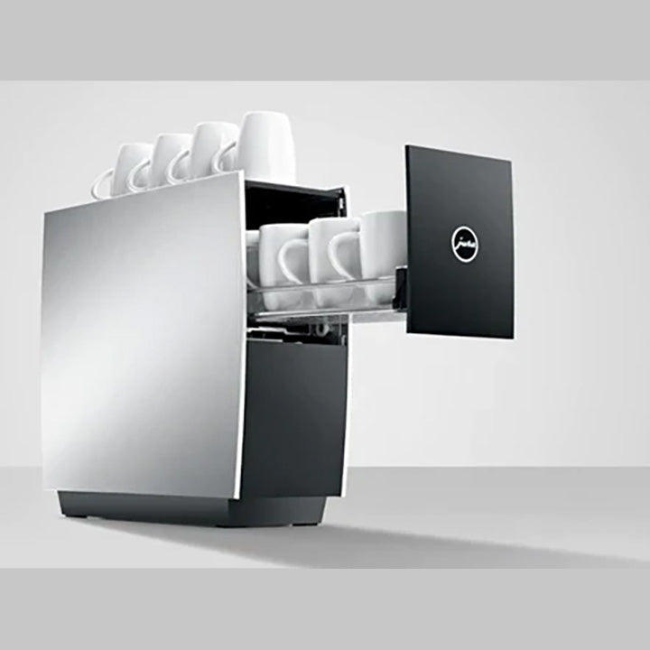 Coffee tastes its best when served hot. That's why all professionals work with correctly pre-warmed cups as a matter of principle. If hot coffee is poured into cold porcelain cups, a lot of heat is lost. Too much, in fact. In pre-warmed cups, however, the mouthwatering aroma is released in its entirety. With the elegant, slim cup warmer, JURA offers the ideal accessory for any automatic specialty coffee machine. Two heating elements constantly keep the cups at a temperature of approximately 55°C — ideal for preparing a fiery espresso or a cappuccino topped with milk foam.
