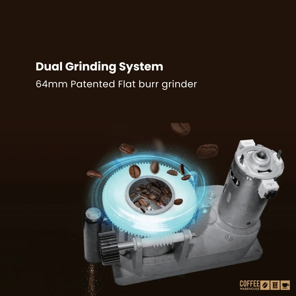 Equipped with dual PGH64 flat burr grinders, featuring 64 mm special steel burrs with a grinding lifespan of up to 500 kg of coffee beans, ensuring durability and consistent grind quality.